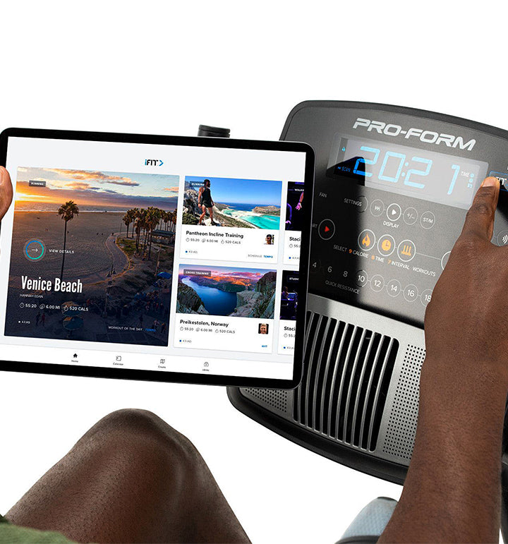 *Access iFit® Coach workouts on your Bluetooth® connected Android™ or iOS tablet. Tablet not included. Access iFit® Coach account from computer, tablet, or smartphone. Membership sold separately.