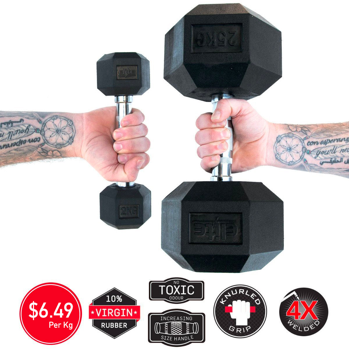 Our Elite Rubber Hex Dumbbells have been engineered with a mix of NBR (rubber and PVC (vinyl) overmolded injection mixture, making them one of the strongest and most durable dumbbells you can find on the market! The durable design includes solid steel heads and securely fastened chrome plated knurled handles that will withstand tough workout environments from home gyms to commercial gyms. The heavy duty rubber removes the impurities and take out the strong odor that you might find in some of the other brands. The Ergonomic design on our rubber hex handles helps to reduce fatigue and maximize comfort. The diamond style knurling on the grips also helps to keep our rubber hex dumbbells from slipping out of your hands.