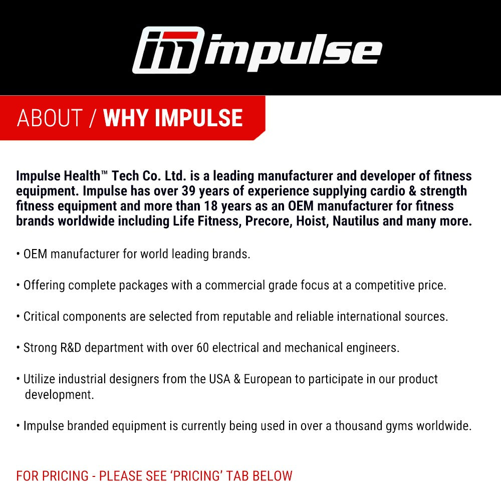 Impulse Health® is a leading manufacturer and developer of fitness equipment. We have over 41 years of experience supplying cardio & strength fitness equipment and more than 21 years as an OEM business, manufacturing fitness equipment for world leading fitness brands.